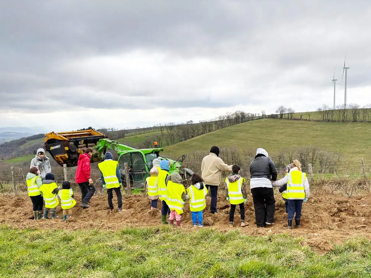 Broquiès : Écoliers, chasseurs et élus réunis pour la plantation d’une haie en faveur de la biodiversité dans le cadre du renouvellement du parc éolien Q ENERGY